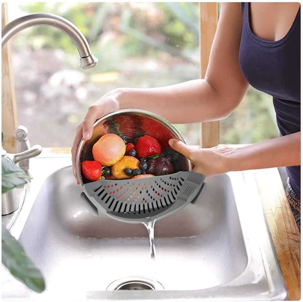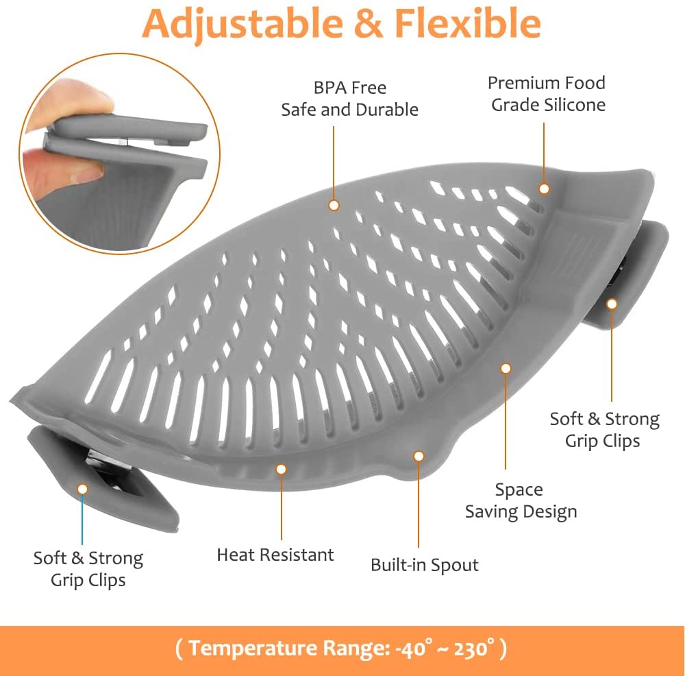 YEVIOR Clip on Strainer for Pots Pan Pasta Strainer, Silicone Food Strainer Hands-Free Pan Strainer, Clip-on Kitchen Food Strainer for Spaghetti, Pasta, Ground Beef Fits All Bowls and Pots - Grey